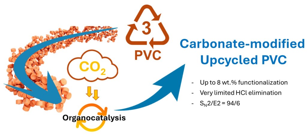 PVC is tough to recycle – its high chlorine content and resistance to standard methods make it a real challenge. Our work tackles this head-on using CO2-binding alcohols (CO2BALs) derived from TBD to upgrade PVC through smart functionalization. We achieved a sharp SN2/E2 selectivity of 94/6 and confirmed successful carbonate grafting. This project paves the way for greener, more efficient PVC upcycling, and a fresh use for captured CO2.
