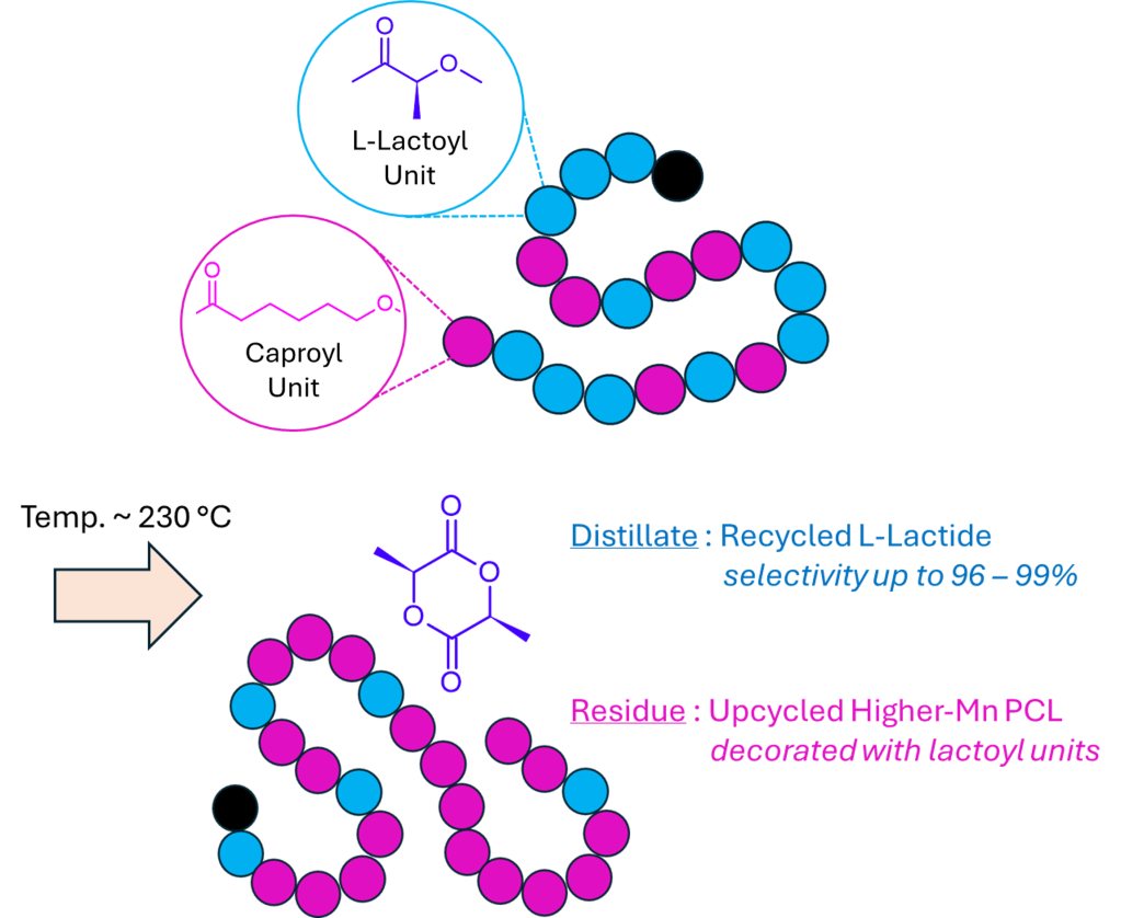Here we show that highly transesterified poly(L-lactide-co-caprolactone) (P(LLA-co-CL)) copolymers undergo low-temperature depolymerization with exceptional selectivity for L-lactide (LLA). Upon vacuum distillation at 230 °C, distillates are recovered that are highly enriched in LLA (up to 96-99 mol%), while the polymer residues reorganize into higher-molar-mass polycaprolactone (PCL) chains sporadically decorated with lactoyl units. The recycling process combines the selective regeneration of virgin-quality LLA with the generation of unprecedented “upcycled PCL” architectures, distinct from conventional PCL and offering new opportunities for property design.