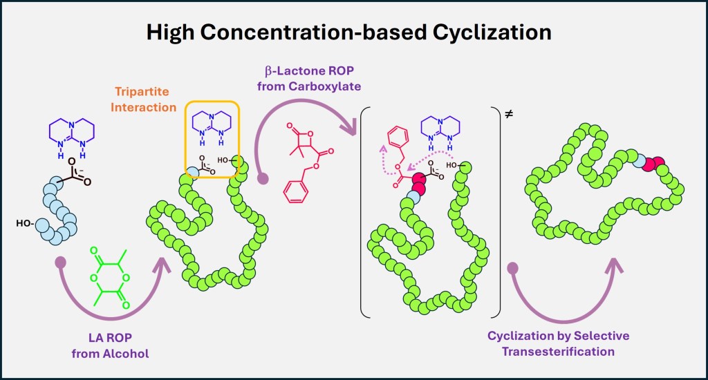 Here, we report a three-step strategy enabling efficient cyclization of high-Mn PLLA at 0.5 M. Key to success is a persistent tripartite complex driven by hydrogen bonding and ion pairing. Selective intramolecular transesterification at a benzylic ester triggers ring closure, affording cyclic PLLA (Mn ≈ 26,000 g/mol) under synthetically practical conditions. SPM imaging reveals nanorings with diameters consistent with the expected contour length of cyclic PLLA chains.