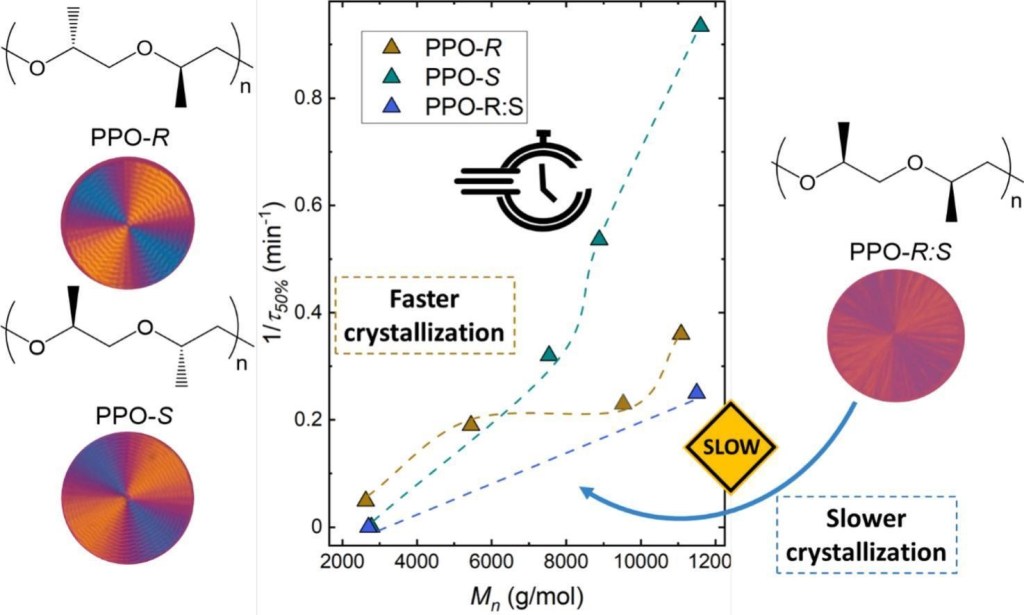This work investigates how chain stereoconfiguration and molecular weight affect the crystallization of poly(propylene oxide) (PPO). Although enantiopure PPO-R and PPO-S crystallize into the same crystal structure, clear and reproducible differences in crystallization kinetics are observed, with an unexpected inversion as molecular weight increases. Racemic PPO-R:S blends show slower crystallization without stereocomplex formation, highlighting subtle chirality-driven effects in the melt and offering new strategies to tune crystallization in PPO-based materials.