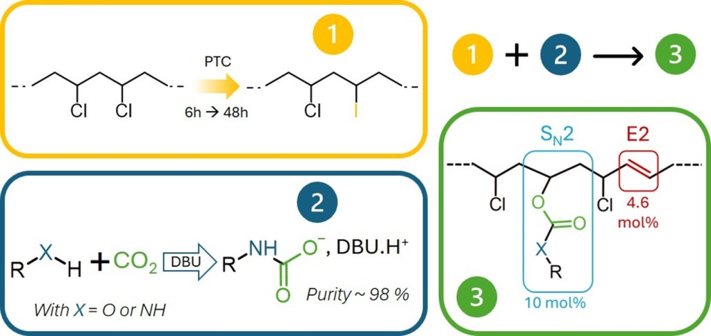 We demonstrate that aqueous phase-transfer catalysis enables selective iodination of PVC under mild and sustainable conditions. Subsequent reaction with a DBU-based CO2-binding amine (CO2BAM) achieves efficient SN2 substitution at CH-X centers, improving CO2 incorporation fourfold relative to previous CO2BAL strategies, reaching a 10 mol% yiled. The polymer remains fully soluble, demonstrating a greener, safer, and effective approach to PVC structural modification.